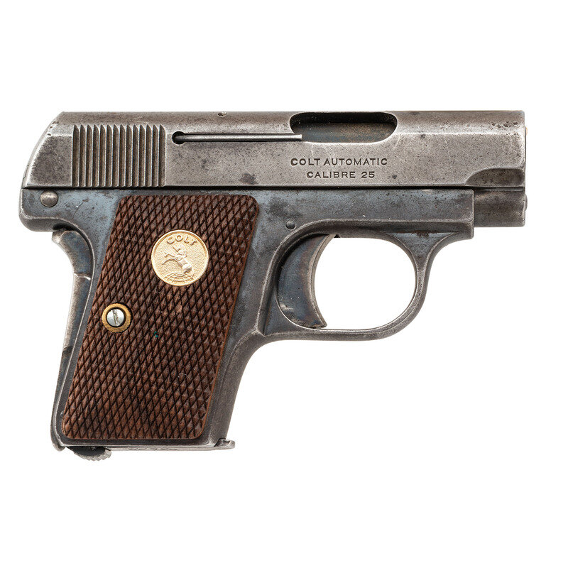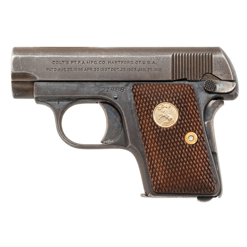 .25 ACP. 2.25" barrel length. SN: 271488. (Mfg ca 1920) Blued metal finish with case colored trigger and grip safety mounting checkered walnut Colt medallion grip panels. Striker action simple blowback operated autoloading pistol fed by detachable single stack magazines mounting low profile front blade and rear notch sights. Left slide marked COLT'S PT. F.A. MFG. CO. HARTFORD, CT. U.S.A./PAT'D AUG. 25, 1896 APR. 20, 1897 DEC. 22, 1903 JAN. 25, 1910. Right marked COLT AUTOMATIC/CALIBRE 25.