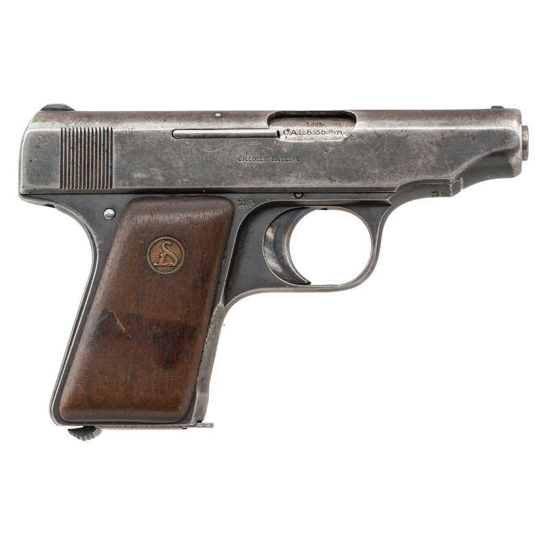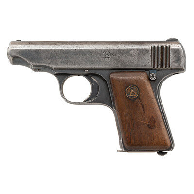 .25 ACP. 2.7" barrel length. SN: 67273. Blued metal finish with polished barrel mounting smooth walnut Deutsche Werke medallion grips. Simple blowback operated striker action autoloading pistol fed by detachable single stack magazines. Item shows standard marks including DEUTSCHE WERKE {D} WERK ERFURT to the left slide and ORTGIES' PATENT to the right. Caliber mark to chamber and {Crown/N} proofs to chamber and slide. Frame struck Germany above the serial number. Numbers match on frame, slide, and barrel.