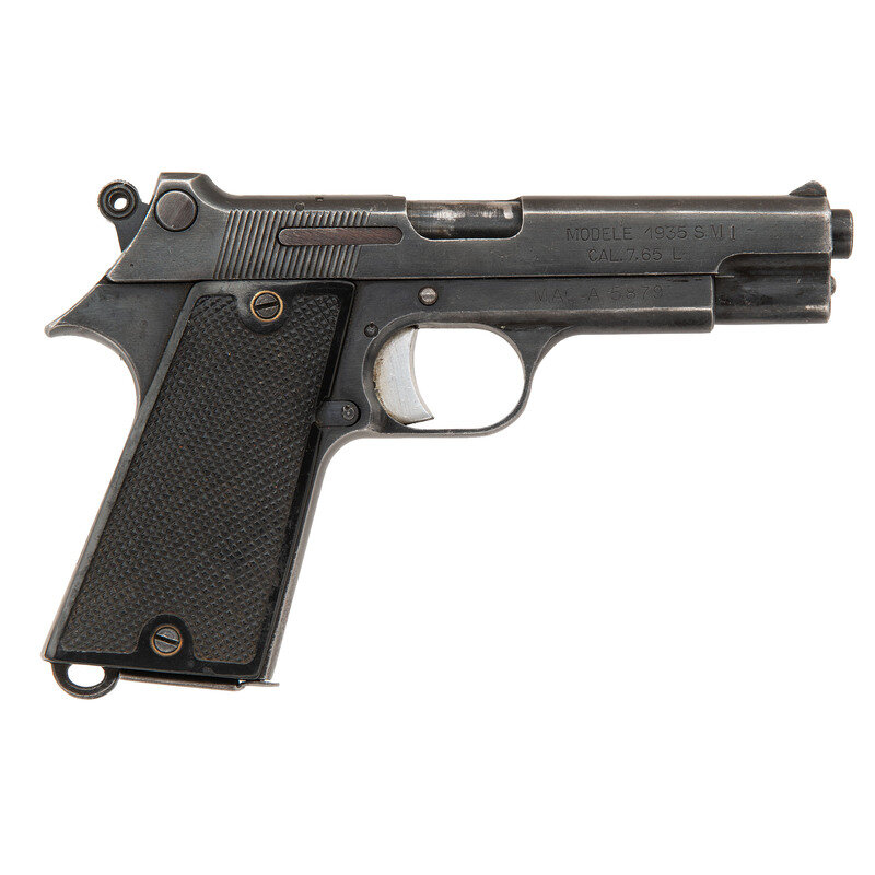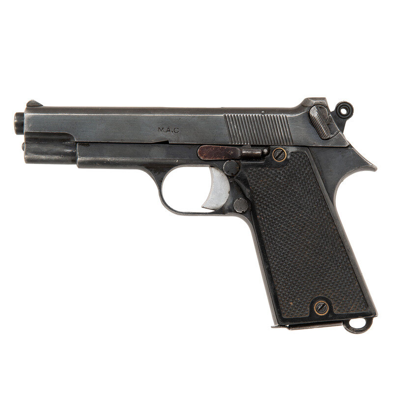 7.65 Longue. 4.29" barrel length. SN: A5879. Blued metal finish with polished barrel mounting checkered black walnut grips. Short recoil operated single action autoloading pistol fed by detachable single stack magazines and featuring a hammer block safety to the left slide. Fixed rear notch and front blade sights. Left slide struck with the maker marking M.A.C., while the right is stamped MODELE 1935 S M1/CAL. 7,65 L. Further MAC maker mark to the right frame forward of the serial number.
