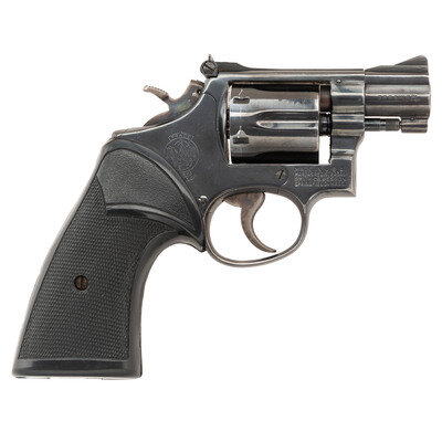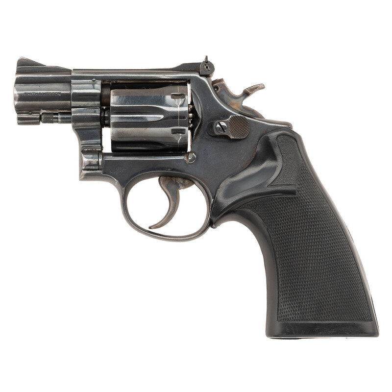 .38 Special. 2" barrel length. SN: K735242. Blued metal refinish overall with case colored hammer and trigger mounting black rubber Pachmayr PRESENTATION GRIP. Double action six-shot hand ejector revolver mounting Baughman Quick Draw pattern front blade and adjustable rear notch sights. Item features a pinned barrel on a three screw frame. Markings include standard model mark to inner frame with four-line address to the right, large Smith & Wesson monogram trademark to sideplate, and make and caliber marks to barrel flanks.