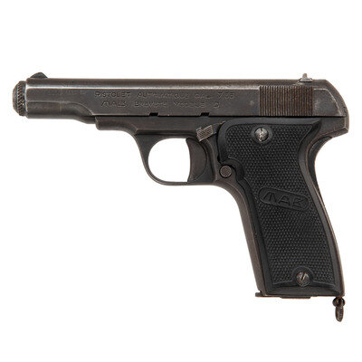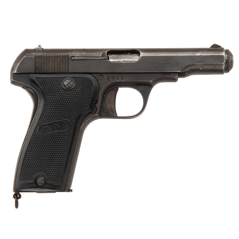 .32 ACP. 4" barrel length. SN: D4380. Blued metal finish with polished barrel mounting checkered black synthetic MAB logo grip panels. Simple blowback operated striker action autoloading pistol fed by detachable single stack magazines. Standard make and model marks include PISTOLET AUTOMATIQUE CAL. 7,65/MAB BREVETE MODELE D to the left slide. Importer mark at left muzzle reads ECCSA FENN NJ. Item missing firing pin guide.