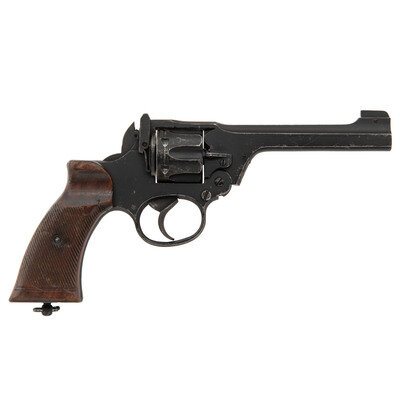 .30/200. 5" barrel length. SN: ZD1968. Black Suncorite finish overall mounting serrated walnut grips with pinned front blade and latch rear notch sights. DAO six-shot top break revolver with automatic ejection. Item features a factory bobbed hammer and lanyard loop to butt. Right frame exhibits weak maker marks with clear I** model marking. Birmingham proofs to all major parts with British {Broad Arrow} marks to major parts. Cylinder is struck S.P.T. 41. Post-war pressure proof applied to left barrel. Caliber mark to barrel rib reads CAL 38. Serial numbers match on frame, cylinder, and barrel.
