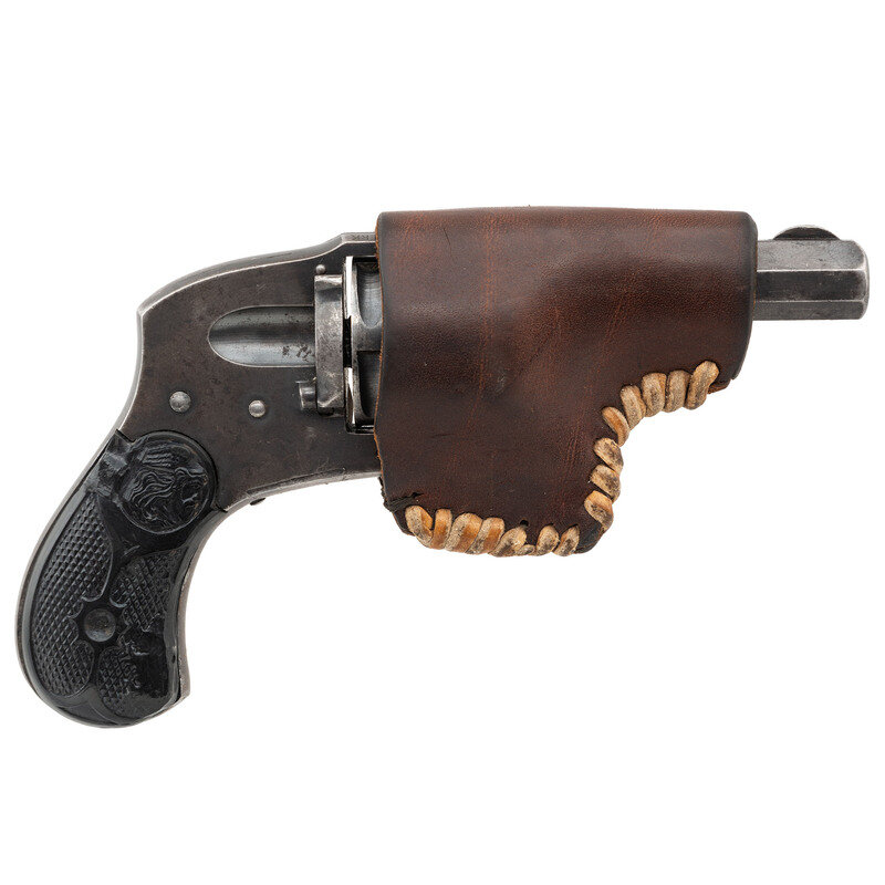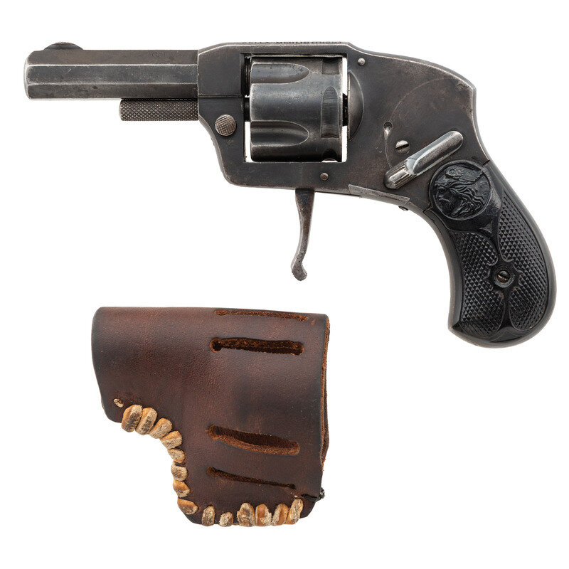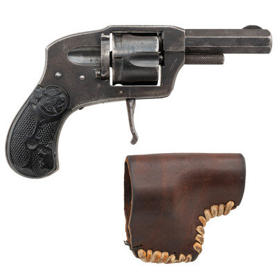.32 Centerfire. 2.5" barrel length. SN: 251936. Blued metal finish overall mounting checkered black synthetic birdshead grips with {Winged Helmet Viking} logos and octagonal barrel. DAO five-shot loading gate revolver with concealed hammer and safety lever to left frame. Topstrap struck with ARMINIUS-WAFFEN-WERK/ZELLA-MEHLIS (THUR). German {Crown/N} proofs to barrel and frame. Caliber mark to left barrel reads Cal. 7,65. Comes with an unmarked leather outside waistband holster.