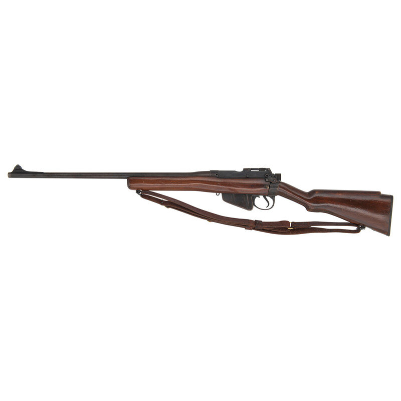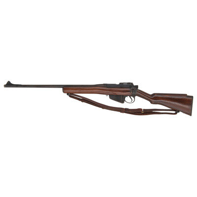 .303 British. 22.5" barrel length. SN: Z24978. Blued metal finish set in varnished walnut semi-pistol grip stock with half length handguard mounting adjustable aperture rear ladder and front bead sight on a matted ramp. Bolt action repeating rifle fed by a semi detachable magazine featuring cock-on-close action. Item shows Birmingham proof marks, and pressure proof marks to the left barrel. The battle sight has been cut off the rear sight. Left receiver struck with standard model mark reading NO.4MK1. Serial numbers match on the bolt handle and receiver. Mounts front and rear sling loops and a tooled leather pattern 1905 sling.
