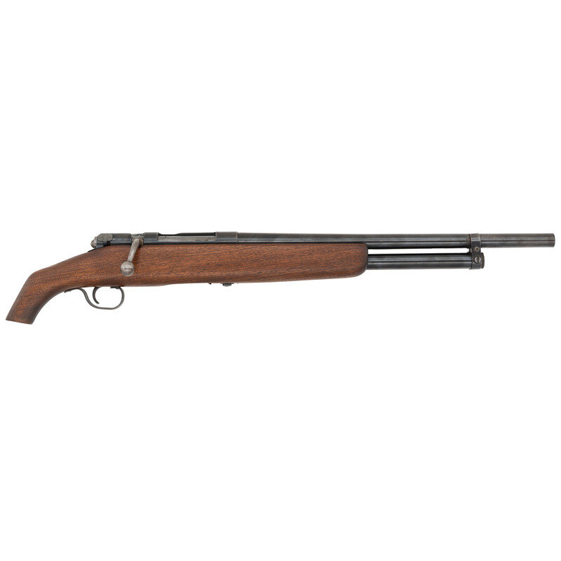 16 Gauge. 18.1" barrel length. SN: NSN. 2.75" Chamber Length. Cylinder Bore. Blued metal finish with cut down barrel and modified shortened stock. Bolt action repeating shotgun with five-shot tube feed magazine. Standard factory markings remain intact overall. 30" overall length.