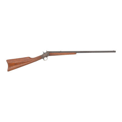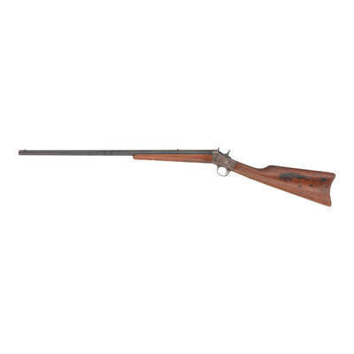 .32 Rimfire. 24" barrel length. SN: 174059. Blued metal finish with case colored frame set in walnut straight wrist stock with crescent butt. Single shot rolling block rifle with dovetail mounted rear notch and front blade sights. Tang is marked REMINGTON ARMS CO./ILION. N.Y. U.S.A. with barrel further displaying single line address reading same. Takedown lever to right frame.