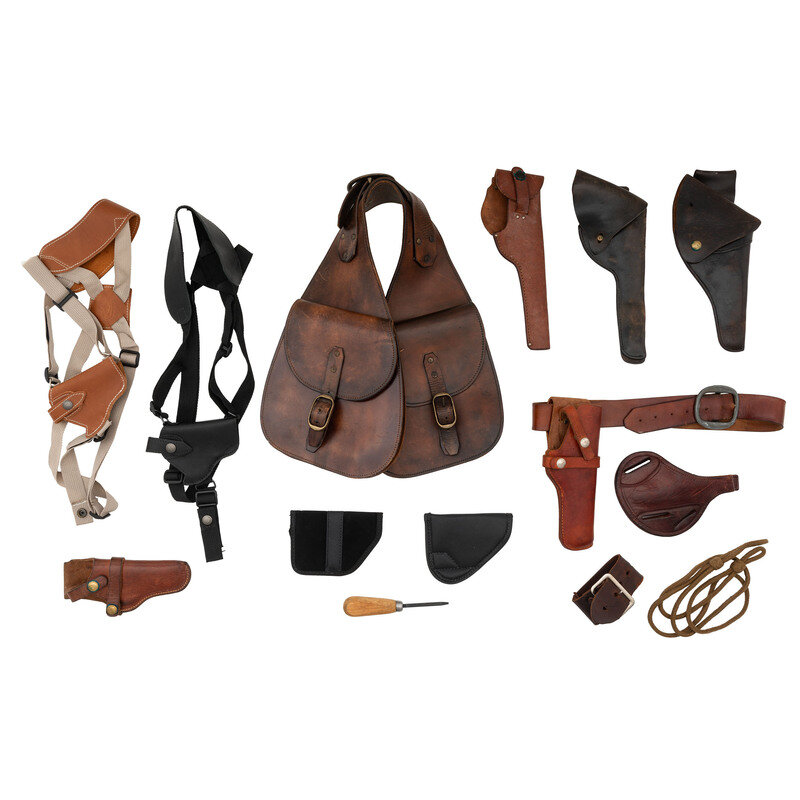 Included in lot: one pair of saddlebags secured with brass snaps with no visible maker marks, unsigned commercial revolver holster in Frontier Era pattern, commercial 1902 pattern holster struck 1132/HE 32 6 on belt loop, BRADLEY E GRIMES CO. leather holster struck 118/22/6 1/2 on the belt loop, small revolver HUNTER holster with faded product number, HUNTER holster with leather belt showing product number 1100 5, Strong outside waistband holster struck 930/51, two BARSONY shoulder holsters, BLACKHAWK! size 4 pocket holster, TAGUA pocket holster, and a wood handled flat head screwdriver.