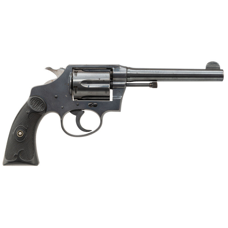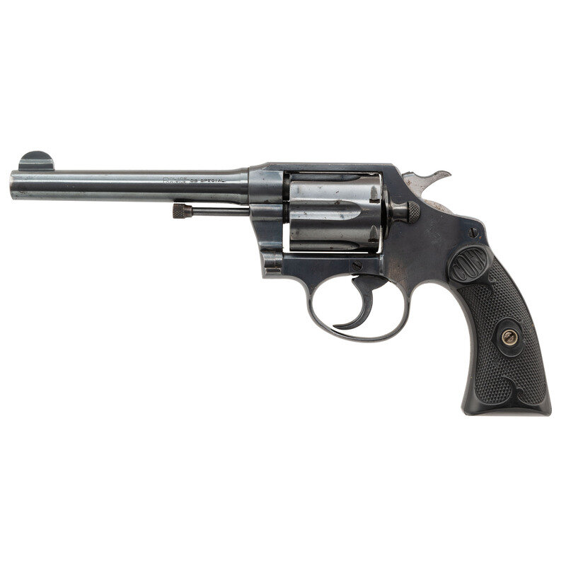 .38 Special. 5" barrel length. SN: 271984. (Mfg ca 1923) Blued metal finish with polished hammer flanks mounting checkered black hardrubber COLT logo grips. Double action six-shot hand ejector revolver mounting half moon front blade and topstrap notch rear sights. Left sideplate struck with a non-circled {Rampant Colt} logo with frame showing the standard VP monogram proof to the forward triggerguard web. Left barrel is marked POLICE-/POSITIVE. 38 SPECIAL. Top of the barrel struck with two-line address and patent reading COLT'S PT. F.A. MFG. CO HARTFORD. CT. U.S.A./PAT'D AUG. 5. 1884. JUNE 5. 1900. JULY 4. 1905.