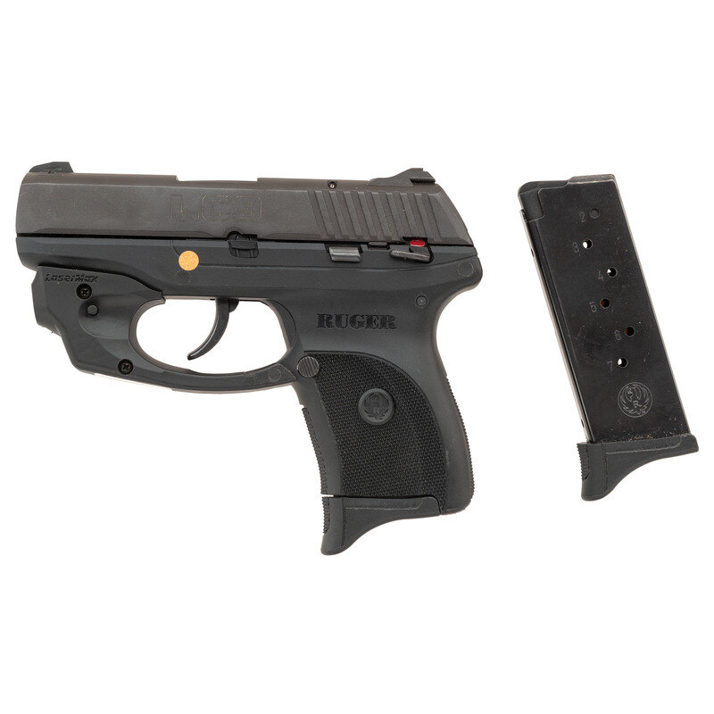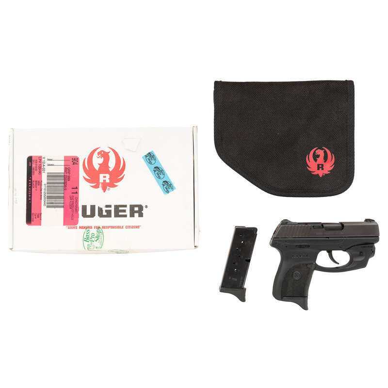 9mm Para. 3.12" barrel length. SN: 322-27853. Matte blued metal finish with black synthetic frame mounting LaserMax triggerguard mounted sight. Short recoil operated single action autoloading pistol fed by detachable single stack magazines. Item mounts triple white dot sights, and shows standard make and model markings overall. Comes in its original white cardboard box with a total of two magazines, both mounting grip extensions, a pair of spare flush floorplates, black synthetic soft case with red Ruger label. owner's manual, factory test casing in opened package, and a RUGER marked padlock in package with key.