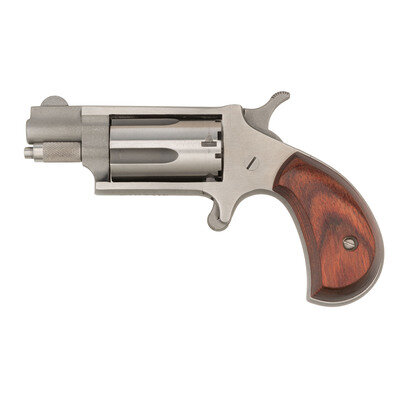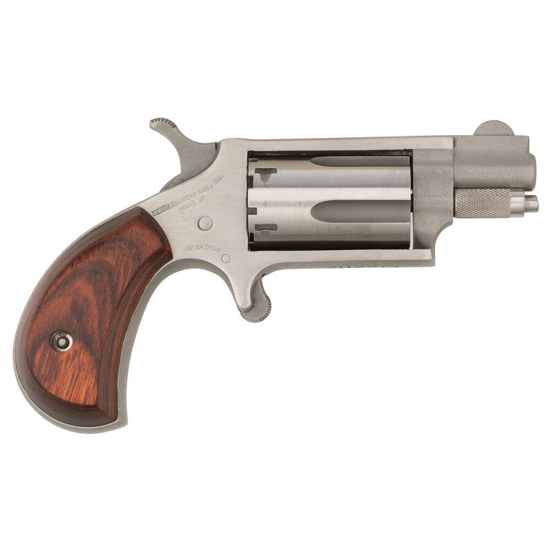 .22 Magnum. 1.125" barrel length. SN: E152112. Brushed stainless steel finish with matte flutes and edges mounting laminated wood birdshead grips. Single action five-shot revolver with spur trigger and mounting half moon front blade and topstrap rear notch sights. Right frame shows manufacturer mark NORTH AMERICAN ARMS INC./PROVO VT followed by caliber marking .22 MAGNUM.