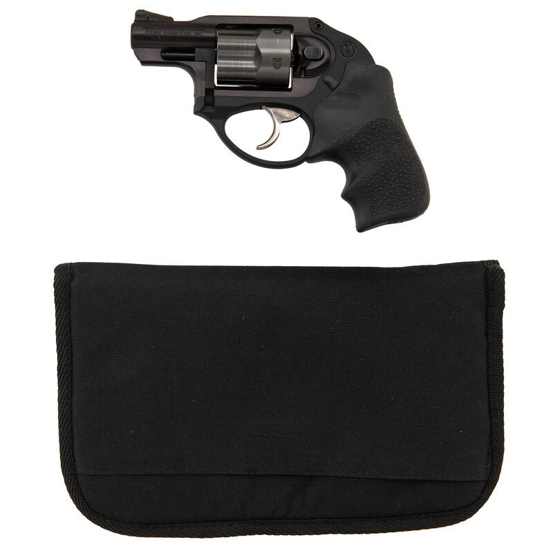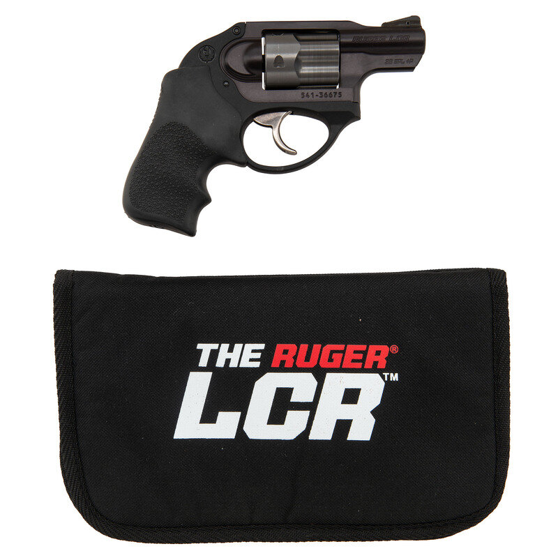 .38 Special. 1.875" barrel length. SN: 541-36675. Matte black finish with gray PVD finish to cylinder and a bright trigger mounting pebble texture and Ruger logo marked Hogue grips. DAO concealed hammer five-shot hand ejector revolver featuring topstrap notch and pinned front ramp sights. Item displays standard make and model markings. Comes with THE RUGER/LCR marked black nylon soft case with factory test casing in package, owner's manual, two internal safety lock keys, and a RUGER marked padlock in package.