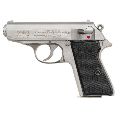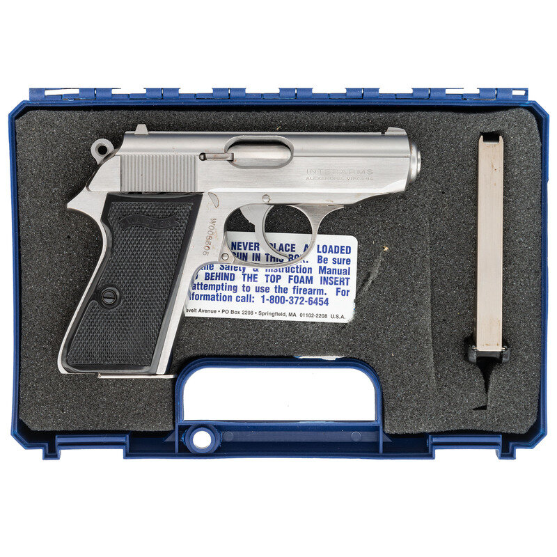 .32 ACP. 3.3" barrel length. SN: W006505. Brushed stainless steel finish overall mounting checkered black synthetic WALTHER banner grips with fixed two dot rear notch and front blade sights. Right slide struck INTERARMS/ALEXANDRIA, VIRGINIA with the left struck UNDER LICENSE OF/Carl Walther Waffenfabrik Ulm/Do./Modell PPK/S Cal. .32 ACP. Comes in matching blue synthetic hard case with owner's manual, factory test target, and one spare magazine.
