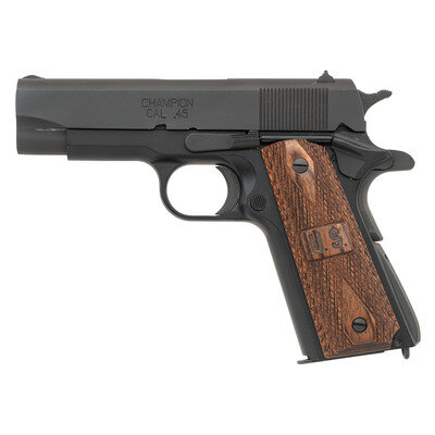 .45 ACP. 4" barrel length. SN: WW135136. Parkerized metal finish with black Anodized frame mounting diamond checkered laminated wood grips with U.S. logos to both panels and mounting military pattern rear notch and front blade sights. Short recoil operated single action autoloading pistol fed by detachable single stack magazines and featuring a bushlingless bull barrel and lanyard loop to butt. Item shows standard make and model markings including CHAMPION/CAL .45 to the left slide. Comes in a green synthetic hard case with one spare McCormick 8-shot magazine, black synthetic outside waistband holster, two-cell black synthetic magazine pouch, cable lock with key, and owner's manual.