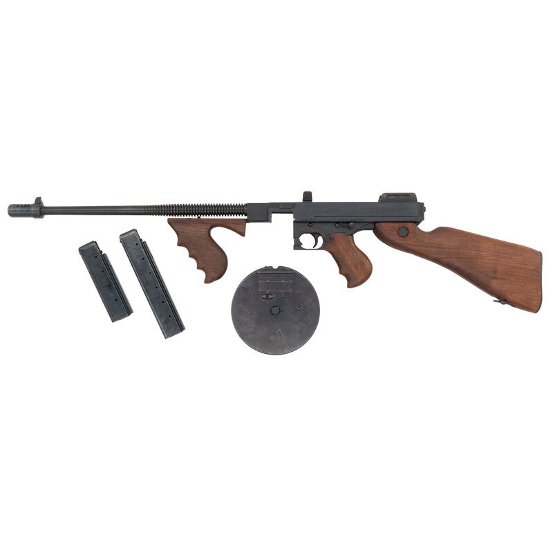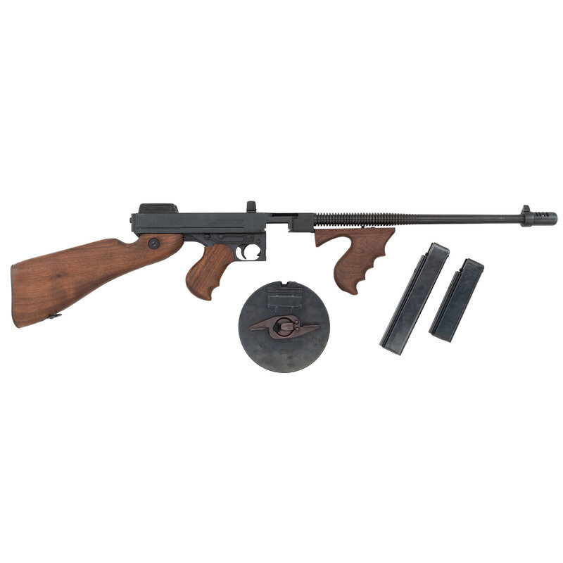 .45 ACP. 19" barrel length (Including compensator). SN: 949. Blued metal finish overall with finned barrel, Cutts pattern compensator, and mounting walnut furniture with pistol grip forend. Simple blowback operated semi-automatic rifle mounting adjustable rear ladder and front blade sights. Comes in an unmarked shipping box with a note from Numrich Arms advertising their then new production 40-shot drum magazines, Auto Ordnance owner's manual, and Department of the Treasury letter copy affirming that the Auto Ordnance Model 1927A1 does not classify as a machine gun. Also included are one 20-shot magazine, one 30-shot, and one 40-shot drum.