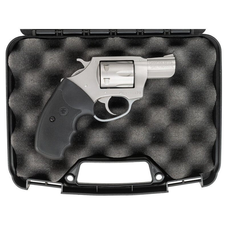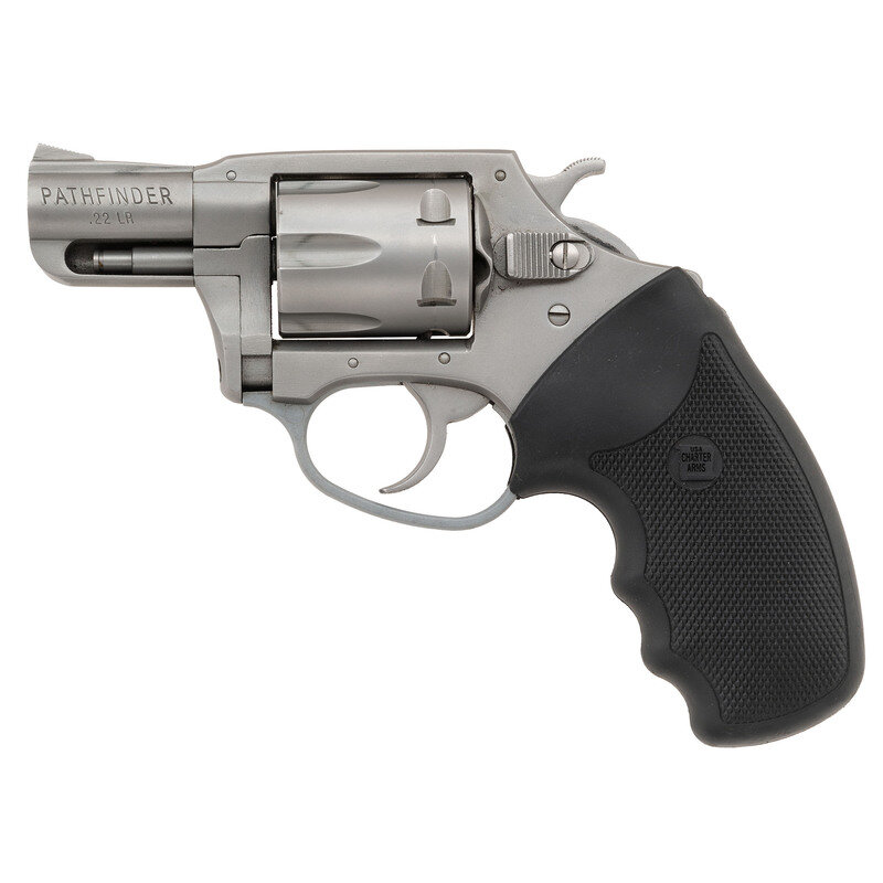 .22 LR. 2" barrel length. 11-08472. Matte stainless and alloy finish overall with checkered black rubber CHARTER/ARMS logo grips mounting matted fixed front ramp and topstrap rear notch sights. Double action six-shot hand ejector revolver. Standard markings include PATHFINDER model mark to left barrel. Comes in a CHARTER/ARMS marked black synthetic hard case with owner's manual and factory test casing in package.