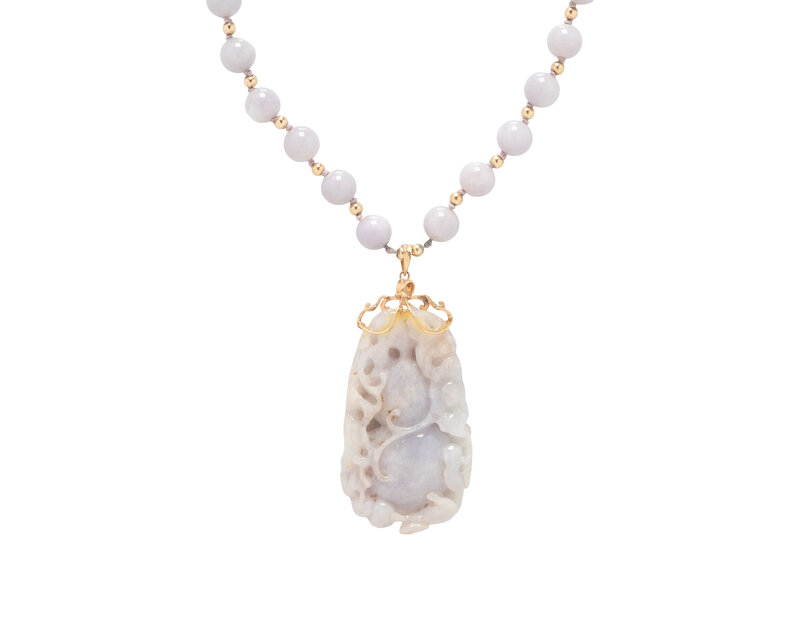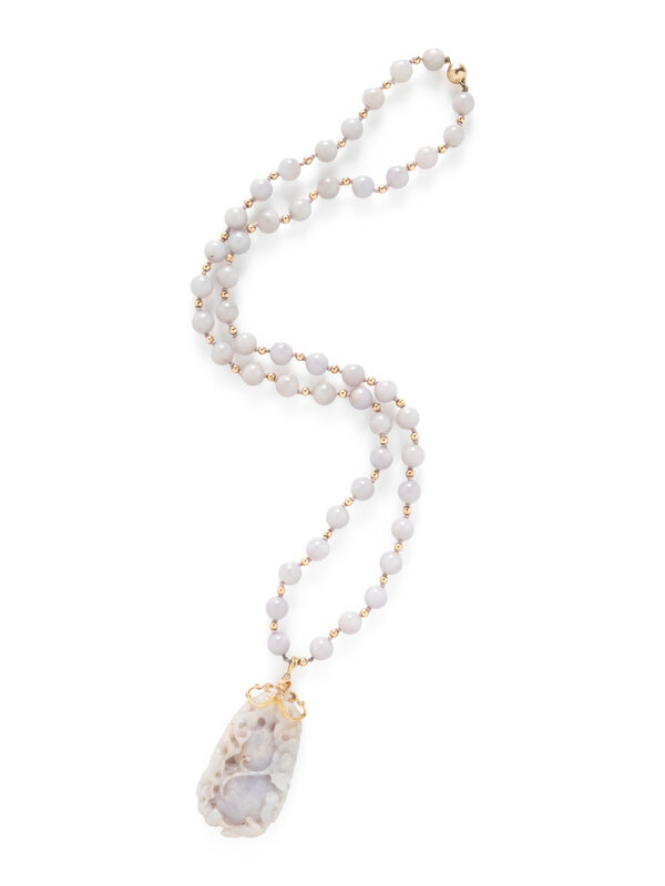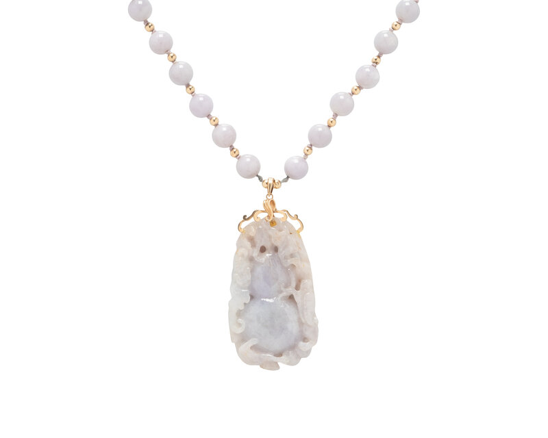 Carved lavender jade measuring approximately 63.15 x 36.60 x 10.85 mm, and string knotted lavender jade beads measuring approximately 10.25 mm. 14 karat yellow gold. 31 1/2 inches long.