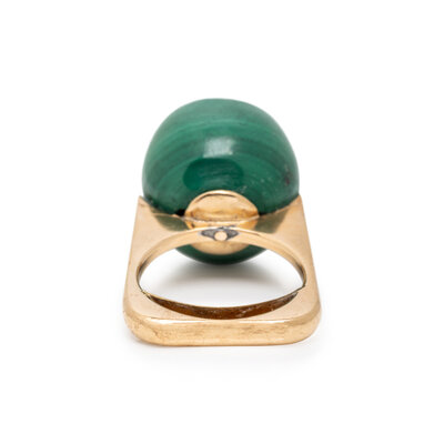Carved malachite and round brilliant cut diamonds. Yellow gold. Ring size 5 1/2.