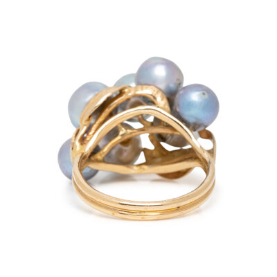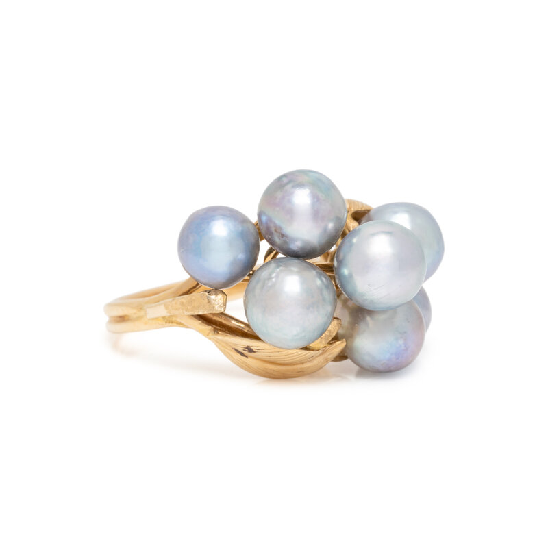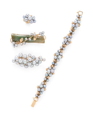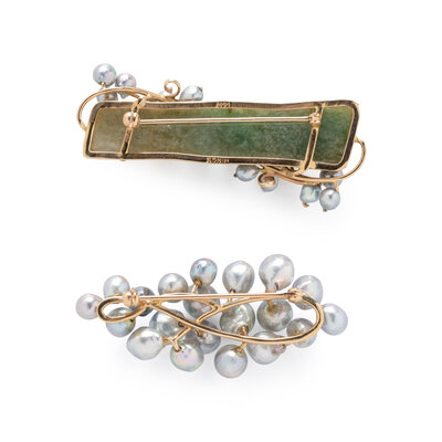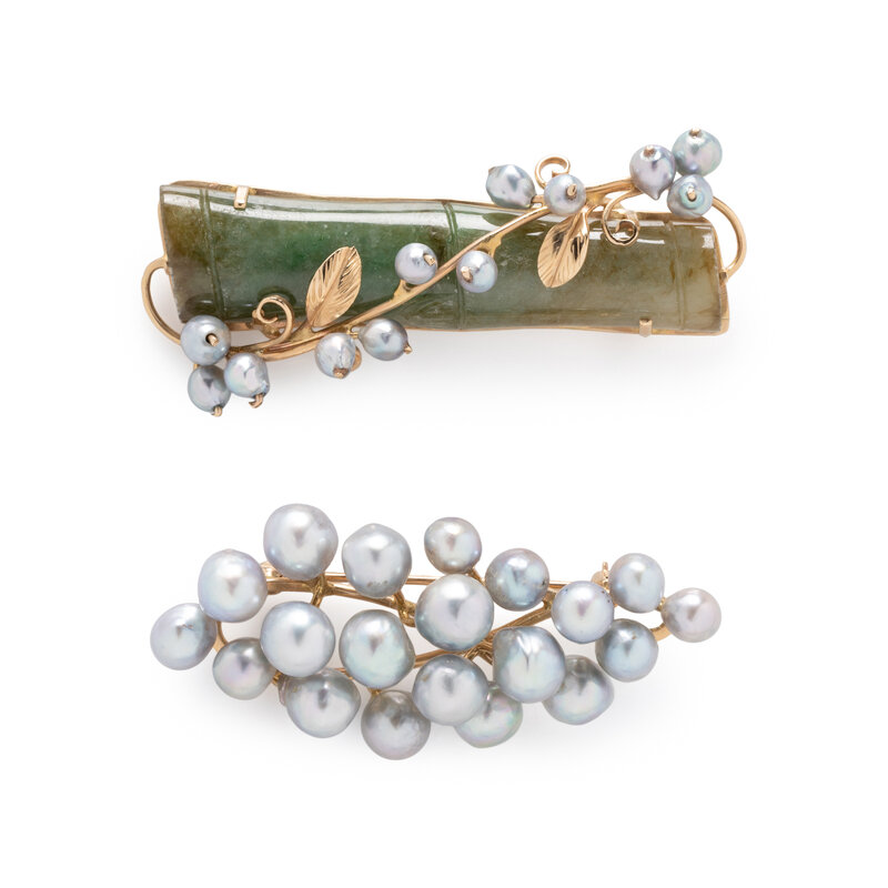 Including a bracelet, brooch, and ring set with baroque cultured pearls, and a brooch set with carved jade designed as a bamboo shoot measuring approximately 54.35 x 14.10 x 4.90 mm, and baroque cultured pearls. Yellow gold. Bracelet: 7 inches long. Pearl brooch: 2 1/4 x 1 inches. Ring size: 6. Jade brooch: 2 3/8 x 7/8 inches.
