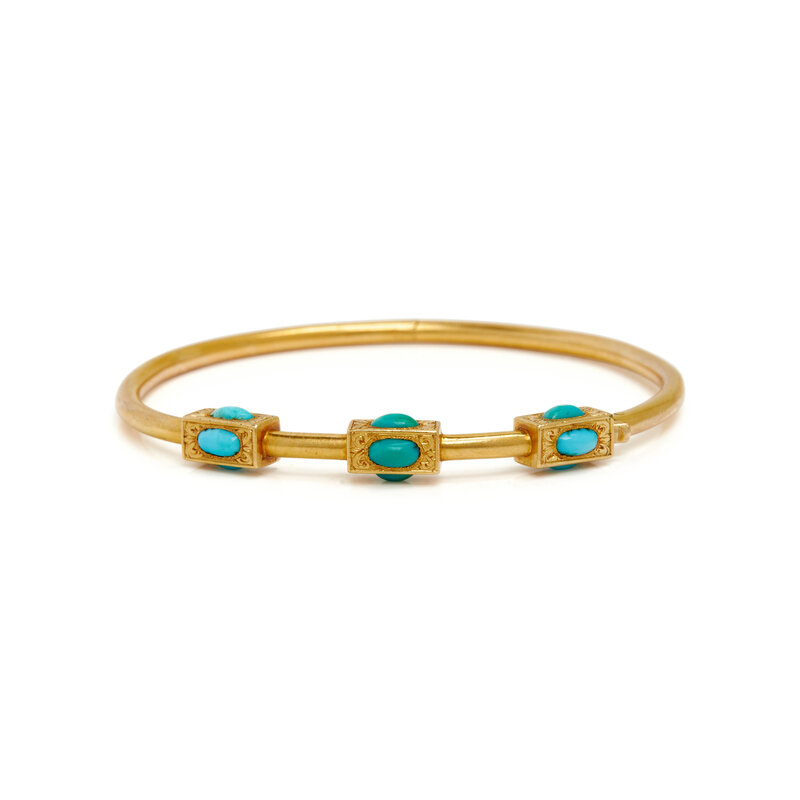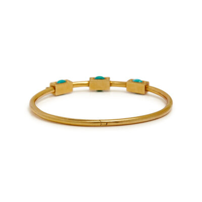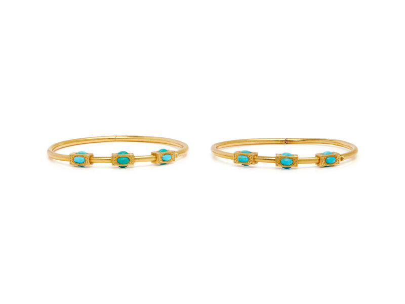 Two bangles, each with nine oval turquoise cabochons, and engraved detail, hinged with clasps. 6 1/4 inches inner circumference.