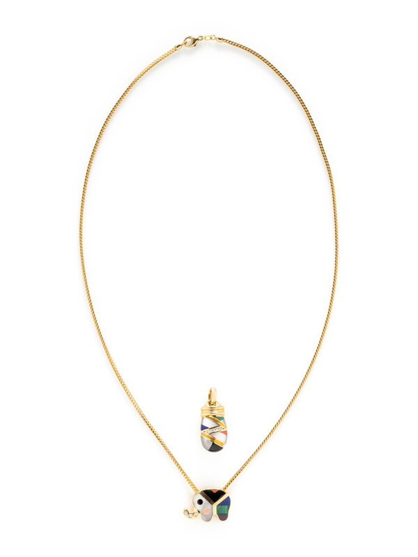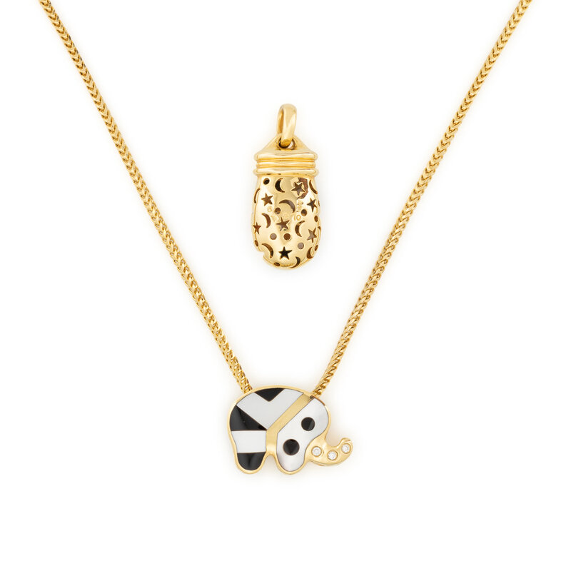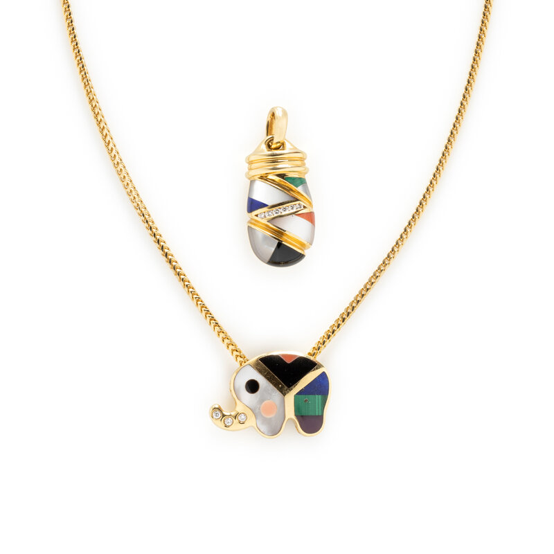 Consisting of two pendants set with mother-of-pearl, round brilliant cut diamonds, coral, onyx, malachite, lapis lazuli, and sugilite, and an unsigned chain. 14 karat yellow gold. Chain: 23 3/4 inches long. Elephant pendant: 3/4 x 1 inch. Oval pendant: 1 inch long.