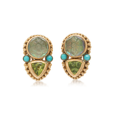 Carved cabochon quartz atop mother of pearl, triangular cut checkerboard faceted peridot and round checkerboard faceted turquoise. 18 karat yellow gold. 7/8 inch long.