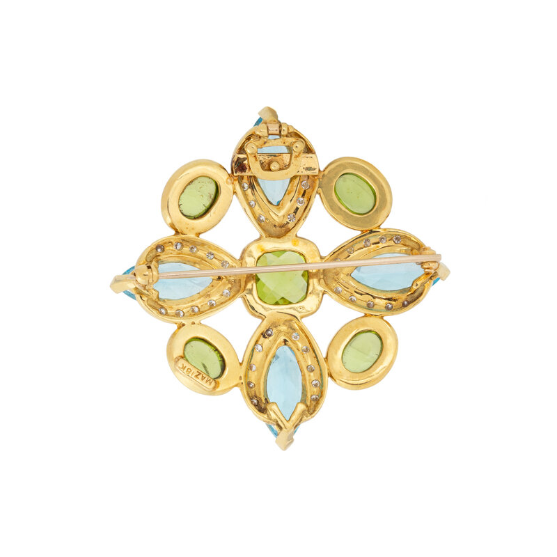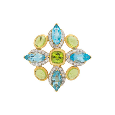 Marquise cut blue topaz, oval cabochon and checkerboard cushion cut peridot, and round brilliant cut diamonds. 18 karat yellow and white gold. 1 7/8 x 1 7/8 inches wide.