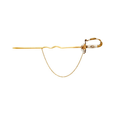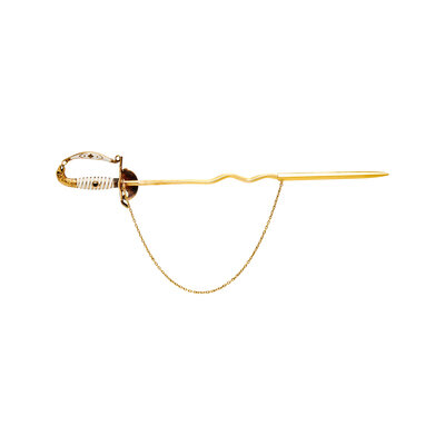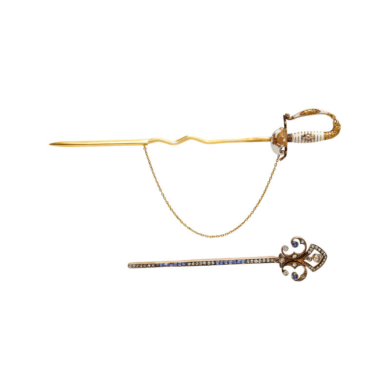Including a pin set with antique cut diamonds and round, square, and rectangular faceted sapphires, and an enameled sword pin set with an old European cut diamond. Yellow gold and silver. 4 1/4 and 6 1/8 inches long.