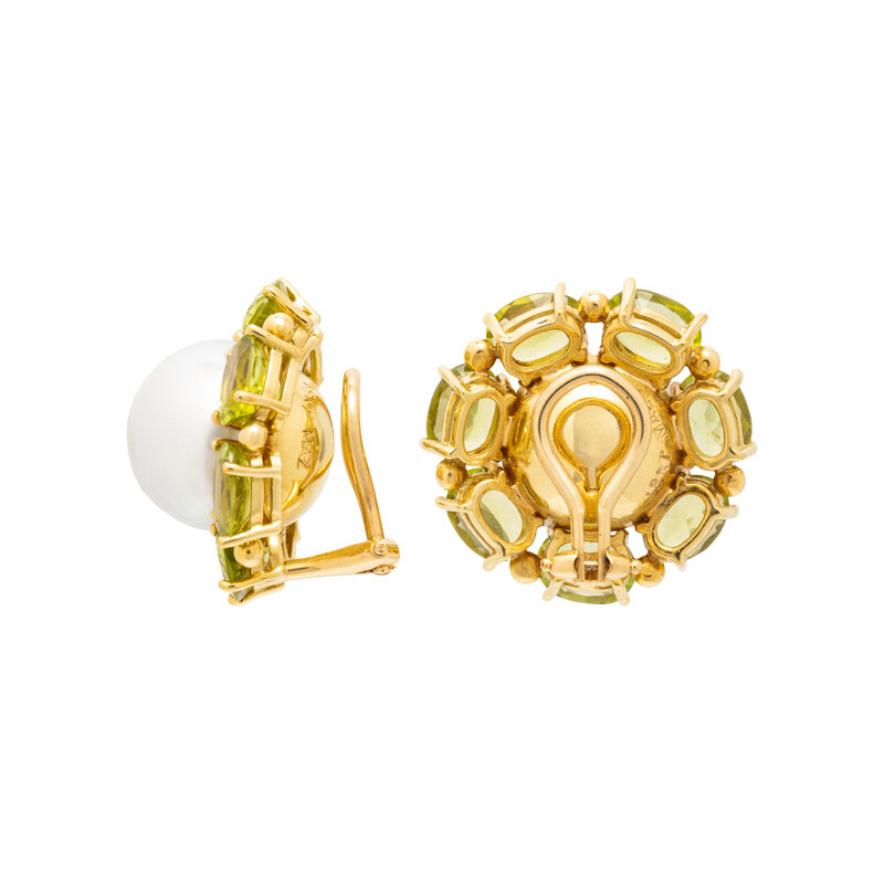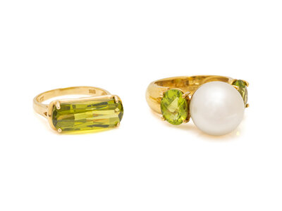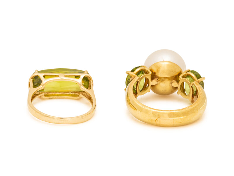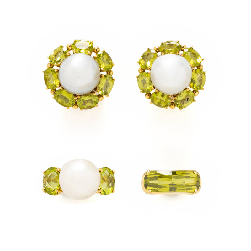 Consisting of a pair of earclips and two rings, set with cultured pearls measuring approximately 13.00-13.50 mm and variously shaped peridot. Ring sizes 7 1/2 and 7 1/4. Earclips: 7/8 inch wide.