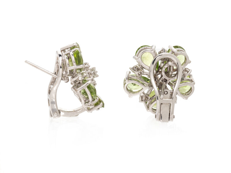 Pear shaped peridot measuring approximately 8.00 x 6.00 mm and round brilliant cut diamonds weighing approximately 0.82 carat total, folding posts with clip backs. 18 karat white gold. 3/4 inch wide.