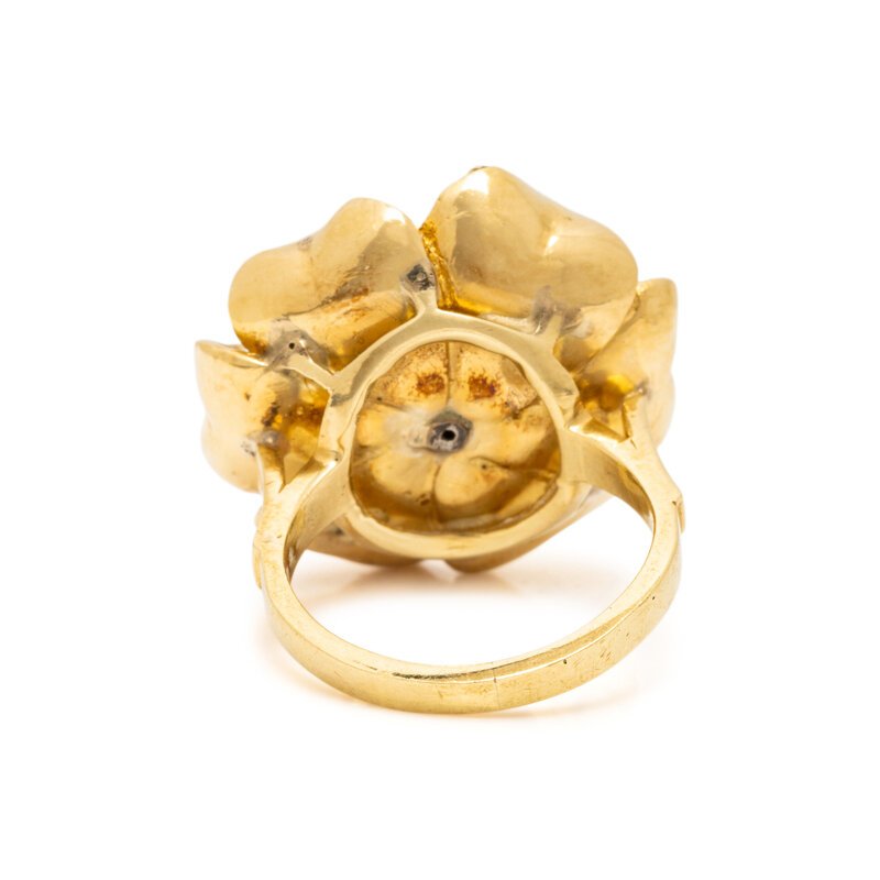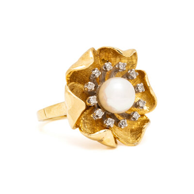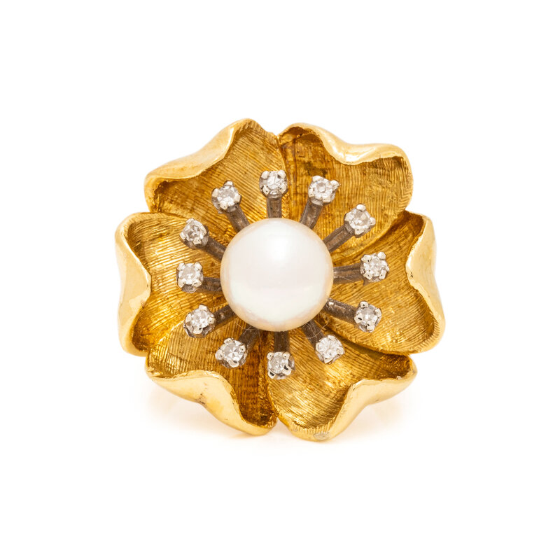 YELLOW GOLD, CULTURED PEARL, AND DIAMOND FLOWER RING