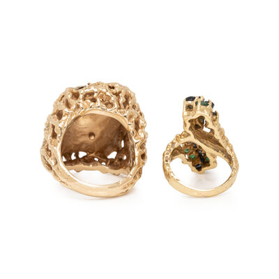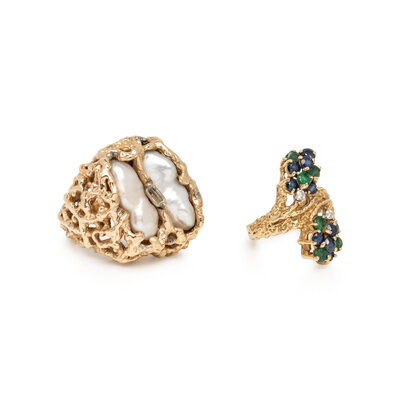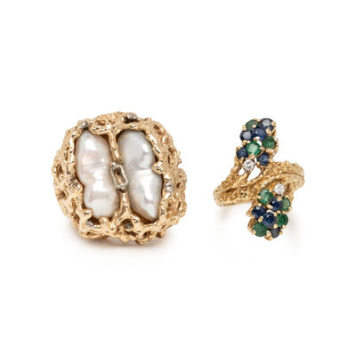 One set with two baroque cultured pearls measuring approximately 16.85 x 6.70 mm, the other set with round faceted sapphires and emeralds, and round brilliant cut diamonds. 14 karat and 18 karat yellow gold. Ring sizes 7 and 4.