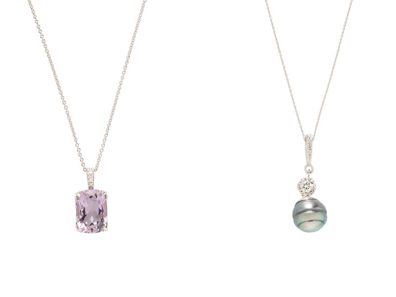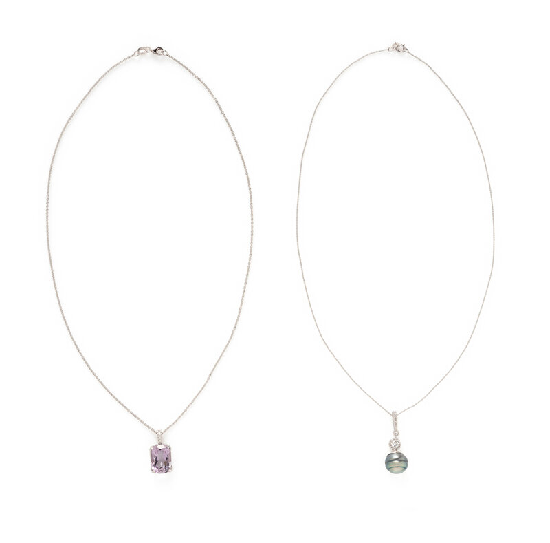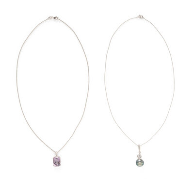One set with a cushion faceted amethyst measuring approximately 14.05 x 10.00 x 7.05 mm and round brilliant cut diamonds, and the other set with a Tahitian cultured pearl measuring approximately 11.30 mm with round brilliant and single cut diamond accents. 14 karat white gold. 18 inches and 18 inches long.