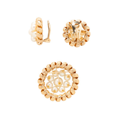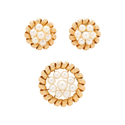 YELLOW GOLD AND CULTURED PEARL BROOCH AND CLIP EARRINGS