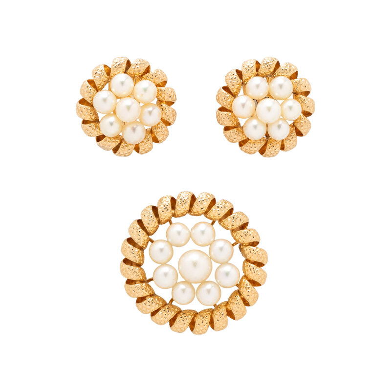 Cultured pearls measuring approximately 6.00 - 6.50 mm. Yellow gold. Brooch: 1 1/4 wide. Clip earrings: 7/8 inch wide.
