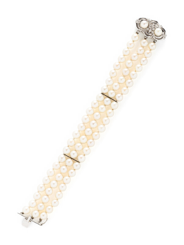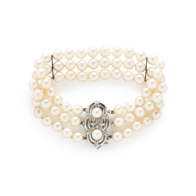 Three strands of string knotted cultured pearls measuring approximately 6.60 mm, with single and round brilliant cut diamond accents on the clasp. 14 karat white gold. 7 1/2 inches long, 1 1/8 inches wide.