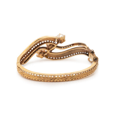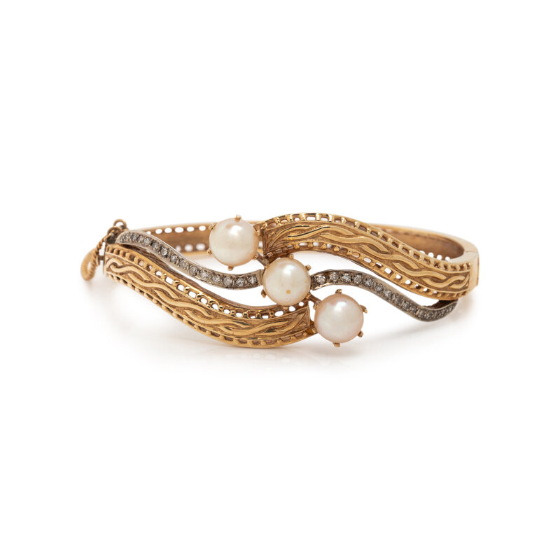 YELLOW GOLD, DIAMOND, AND CULTURED PEARL BANGLE BRACELET