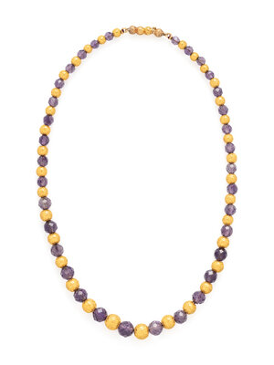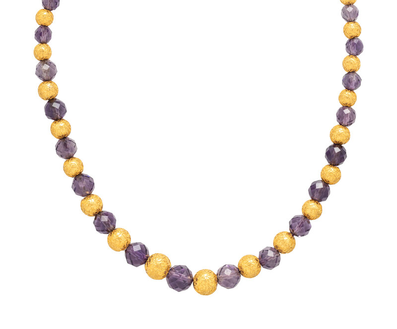 Alternating faceted graduating amethyst beads and textured yellow gold beads with wirework detail. 16 inches long.