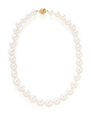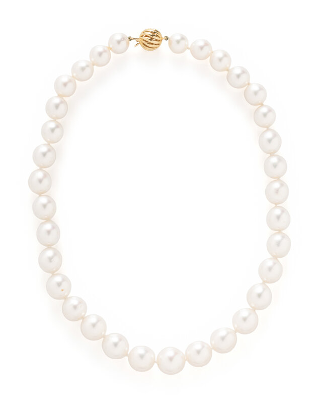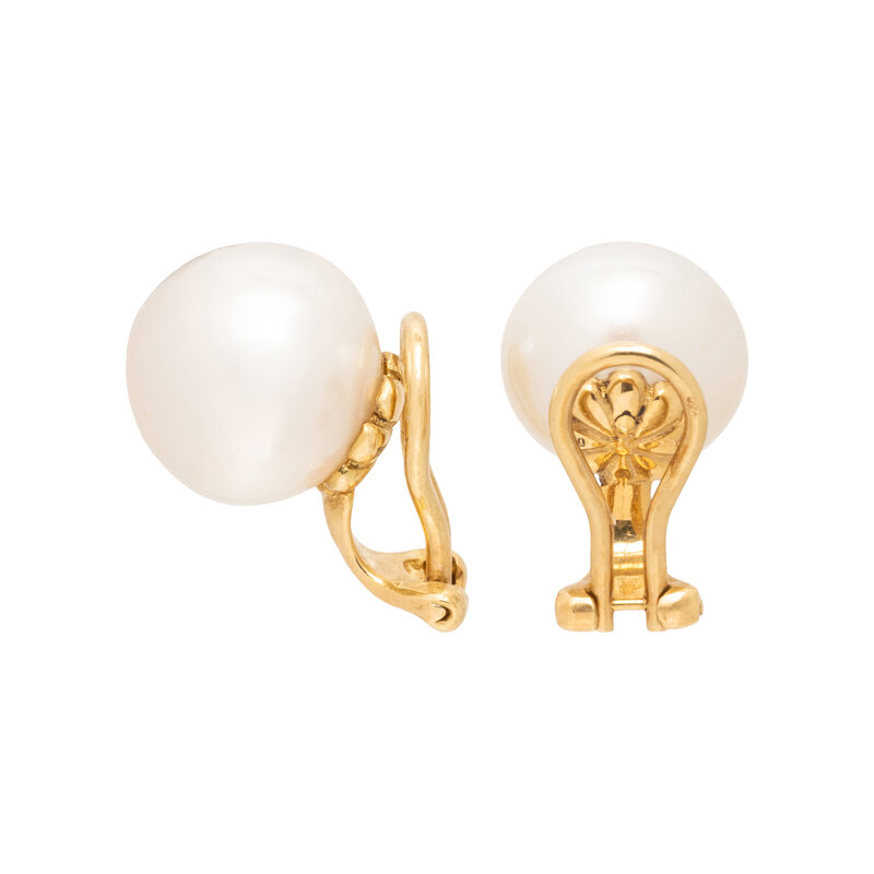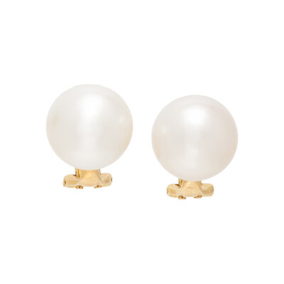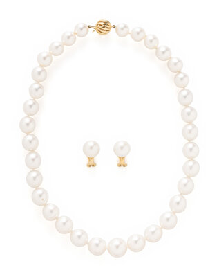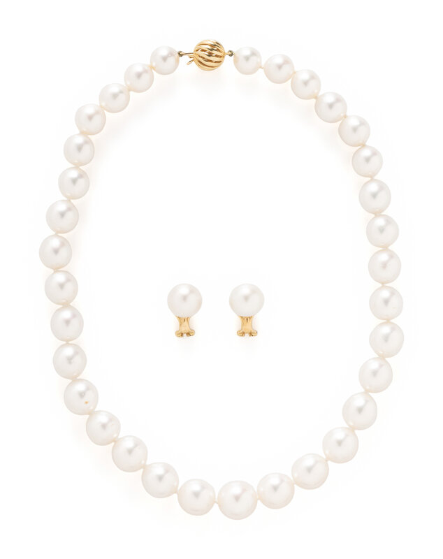 Cultured pearls measuring approximately 10.00 - 14.00 mm. 18 karat yellow gold. Necklace: 17 1/2 inches long. Clip earrings: 12.50 mm.
