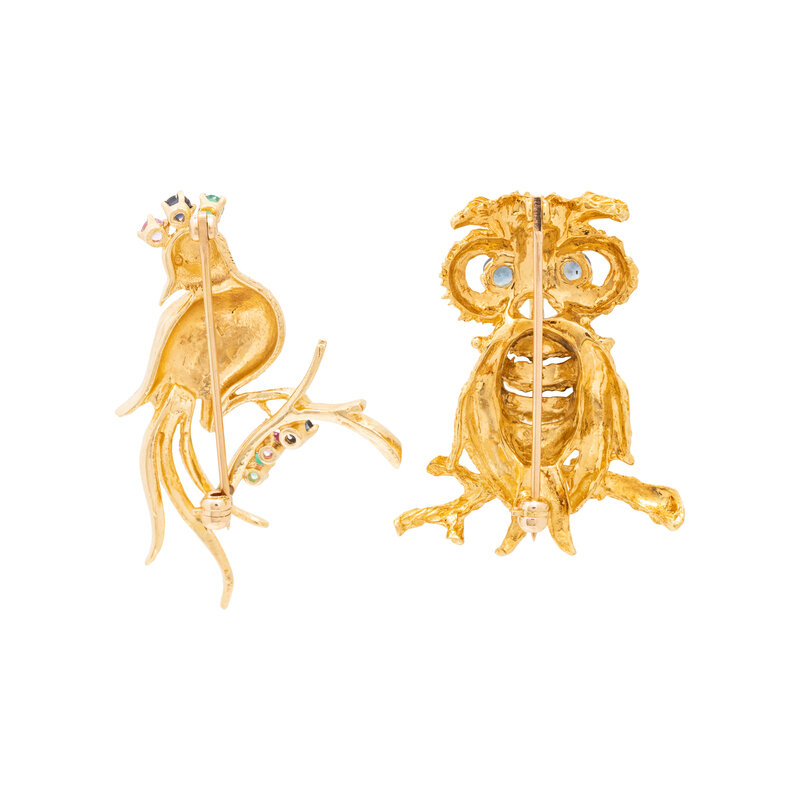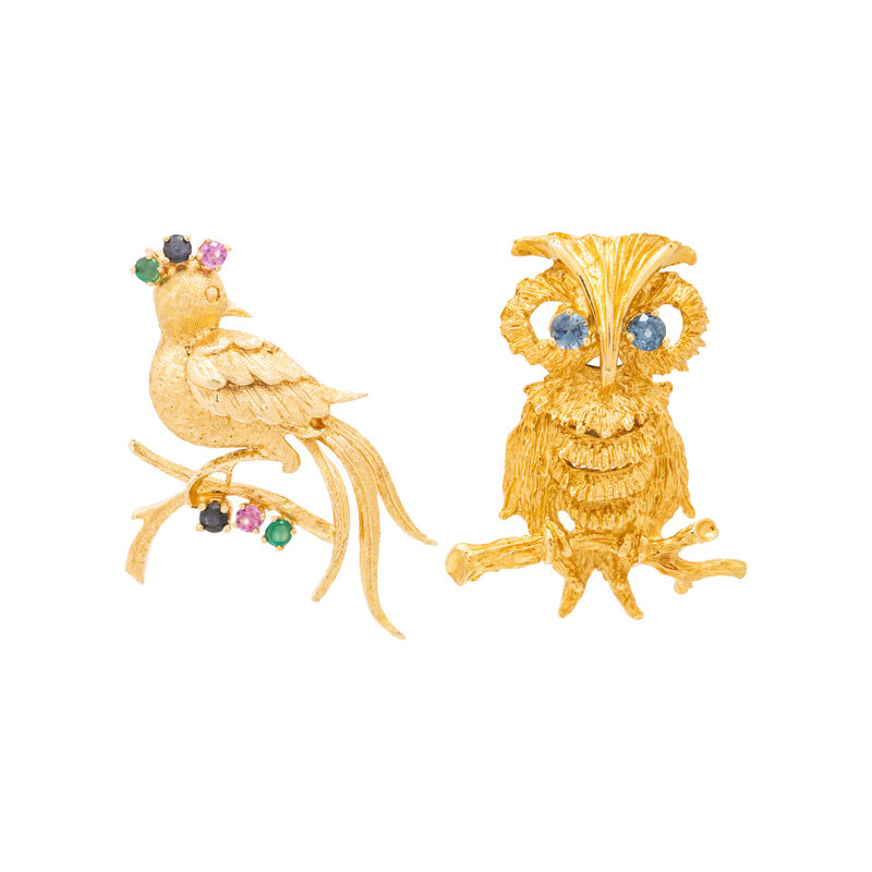 COLLECTION OF YELLOW GOLD AND MULTIGEM BIRD PINS