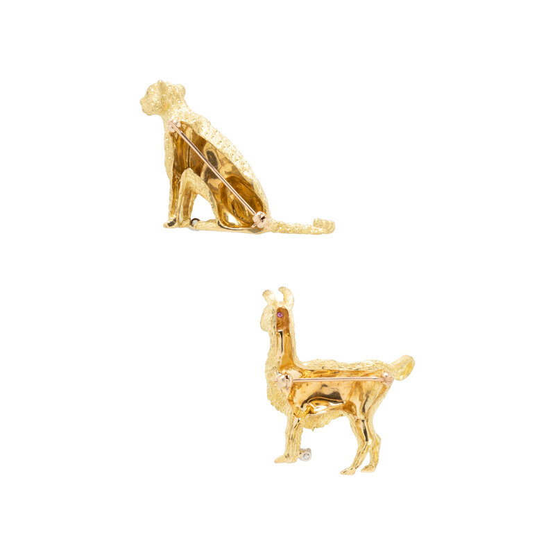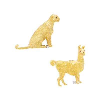 Round brilliant cut diamonds and ruby eyes. 18 karat yellow gold. Cheetah: 1 1/4 x 1 1/4 inches. Llama: 1 1/2 x 1 1/4 inches.
