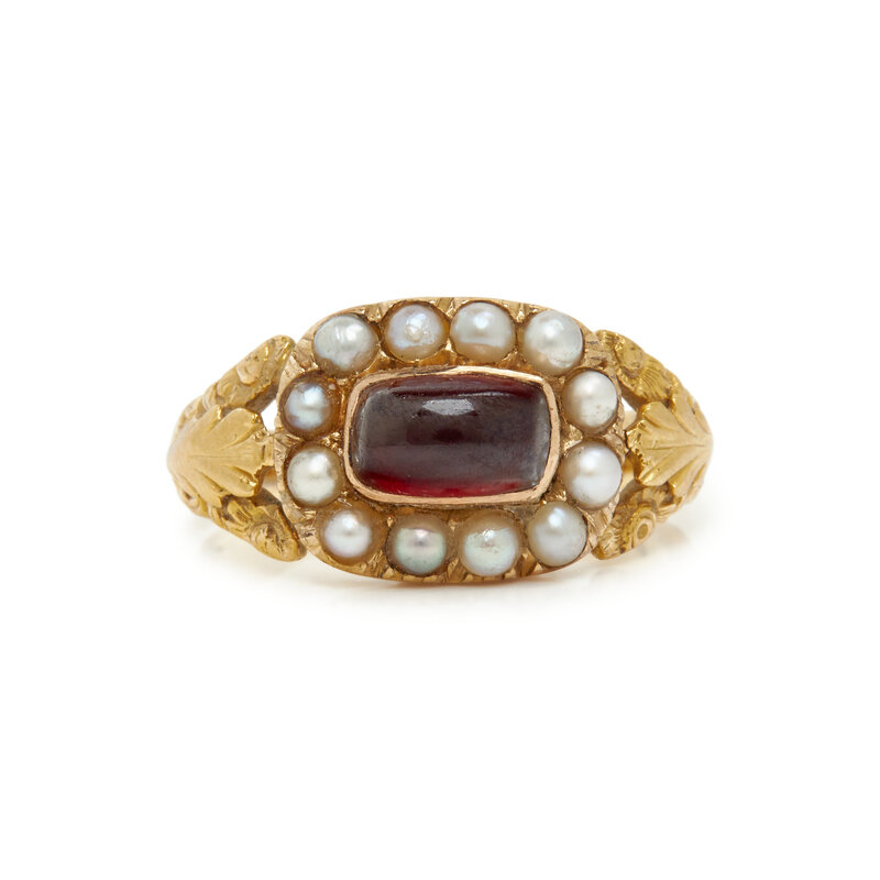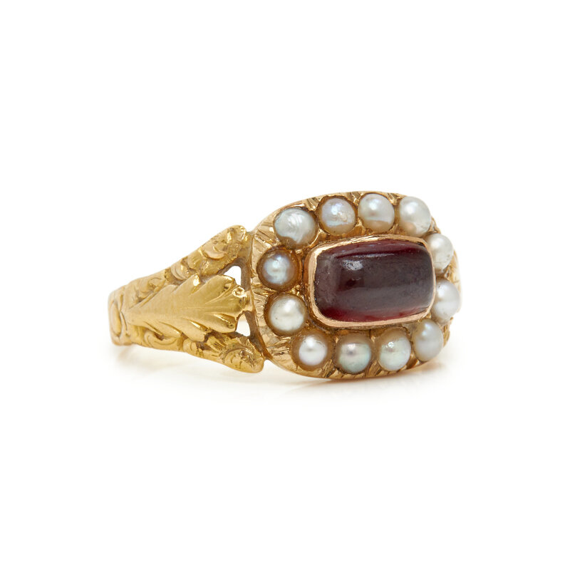VICTORIAN, YELLOW GOLD, GARNET, AND SEED PEARL RING