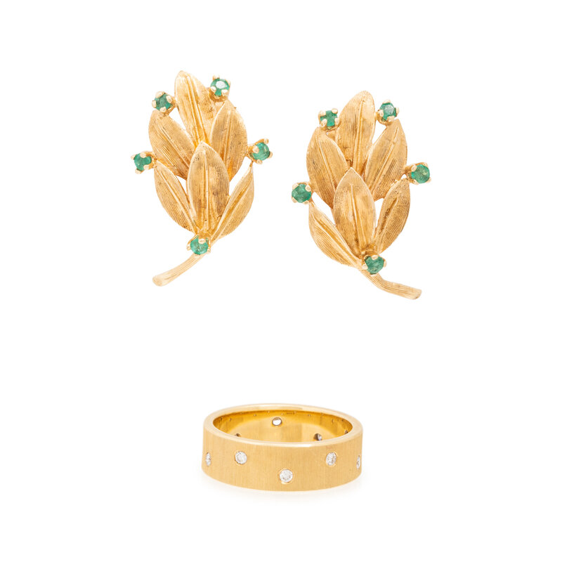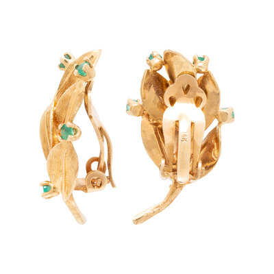Round brilliant cut diamonds and round faceted emeralds. Yellow gold. Ring size 6 1/4. Earclips: 1 inch long.