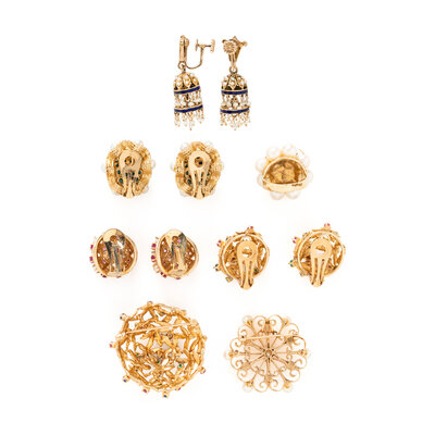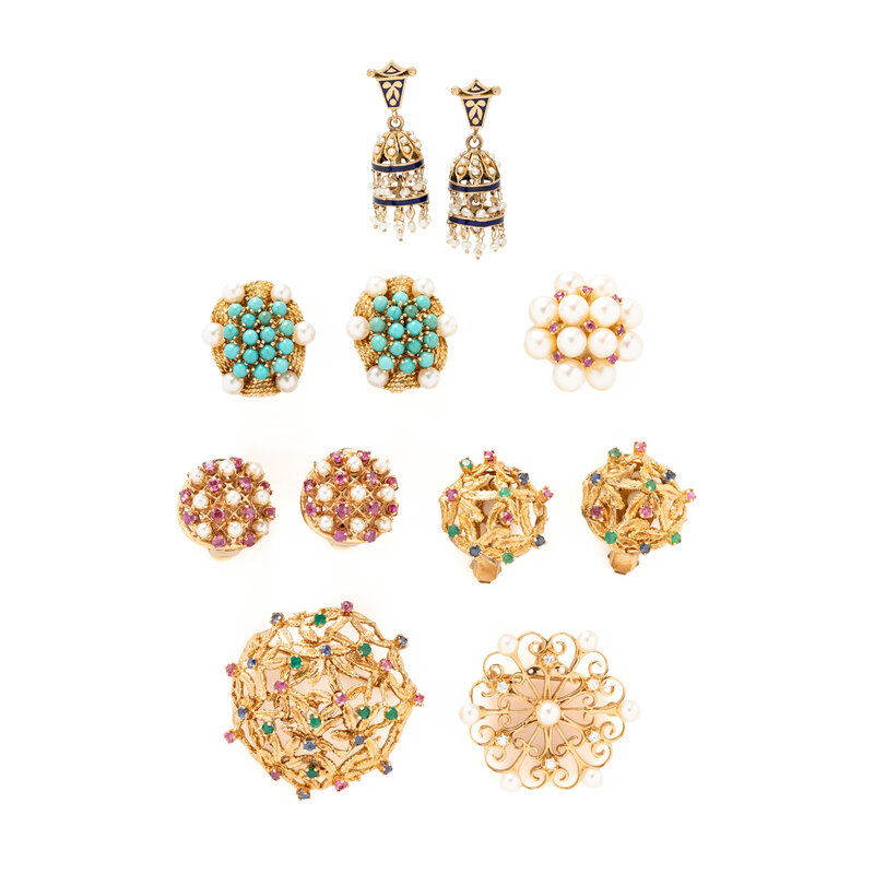 Consisting of two brooches, four sets of clip earrings, and one ring, variously set with cultured pearls, seed pearls, turquoise, rubies, sapphires, chrysoprase, and diamonds.