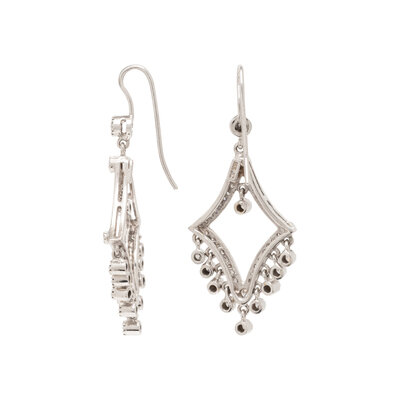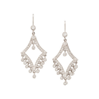 Round brilliant cut diamonds weighing approximately 1.00 carat total. 18 karat white gold. 1 1/4 inches long.