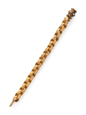 Blue cabochon accents. Yellow gold. 6 3/4 inches long.