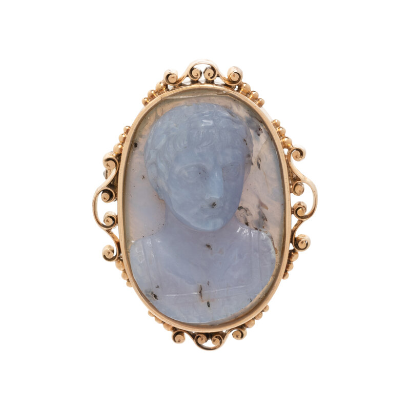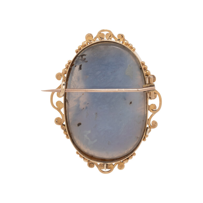 Chalcedony cameo measuring approximately 34.00 x 23.00 mm. Yellow gold. 1 1/2 x 1 1/4 inches.