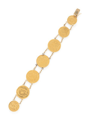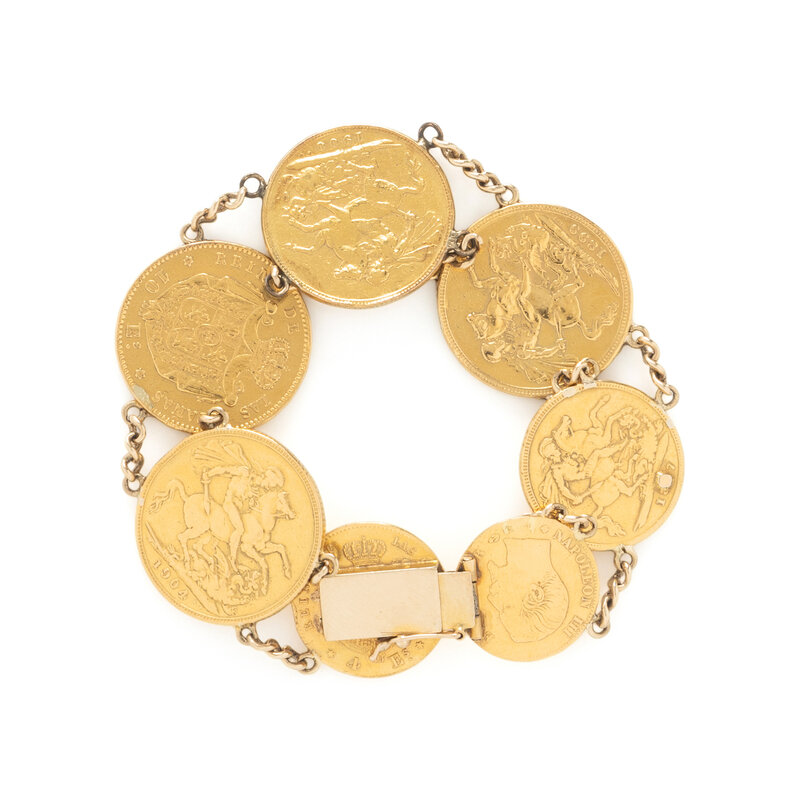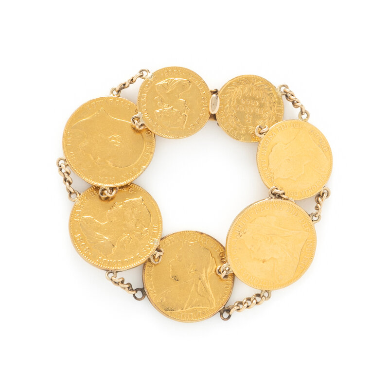 British, French, and Spanish gold coins. Yellow gold. 7 3/8 inches long.