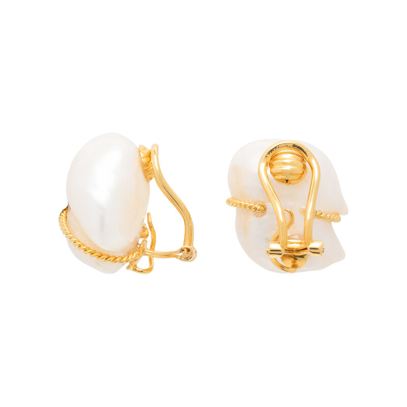 Baroque cultured pearls measuring approximately 18.00 x 15.00 x 12.00 mm and cushion cabochon onyx measuring approximately 16.00 x 16.10 x 7.00 mm. 14 karat yellow gold. 3/4 inches long.