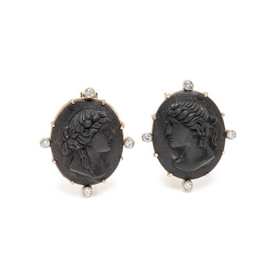 Black stone cameos and round brilliant cut diamonds. 14 karat yellow gold. 1 1/8 inches x 1 inch.