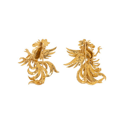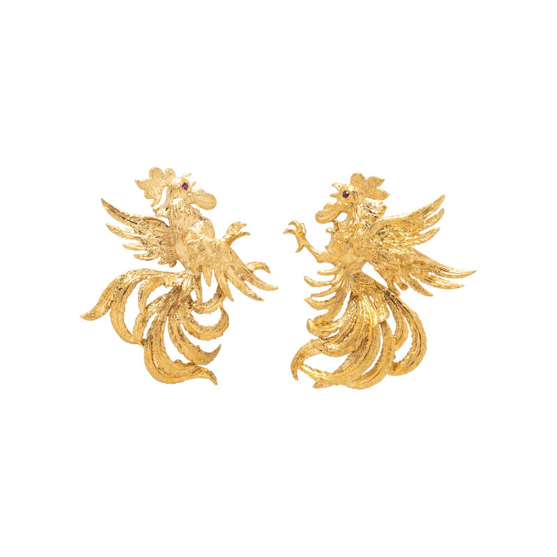 PAIR OF YELLOW GOLD AND RUBY ROOSTER BROOCHES